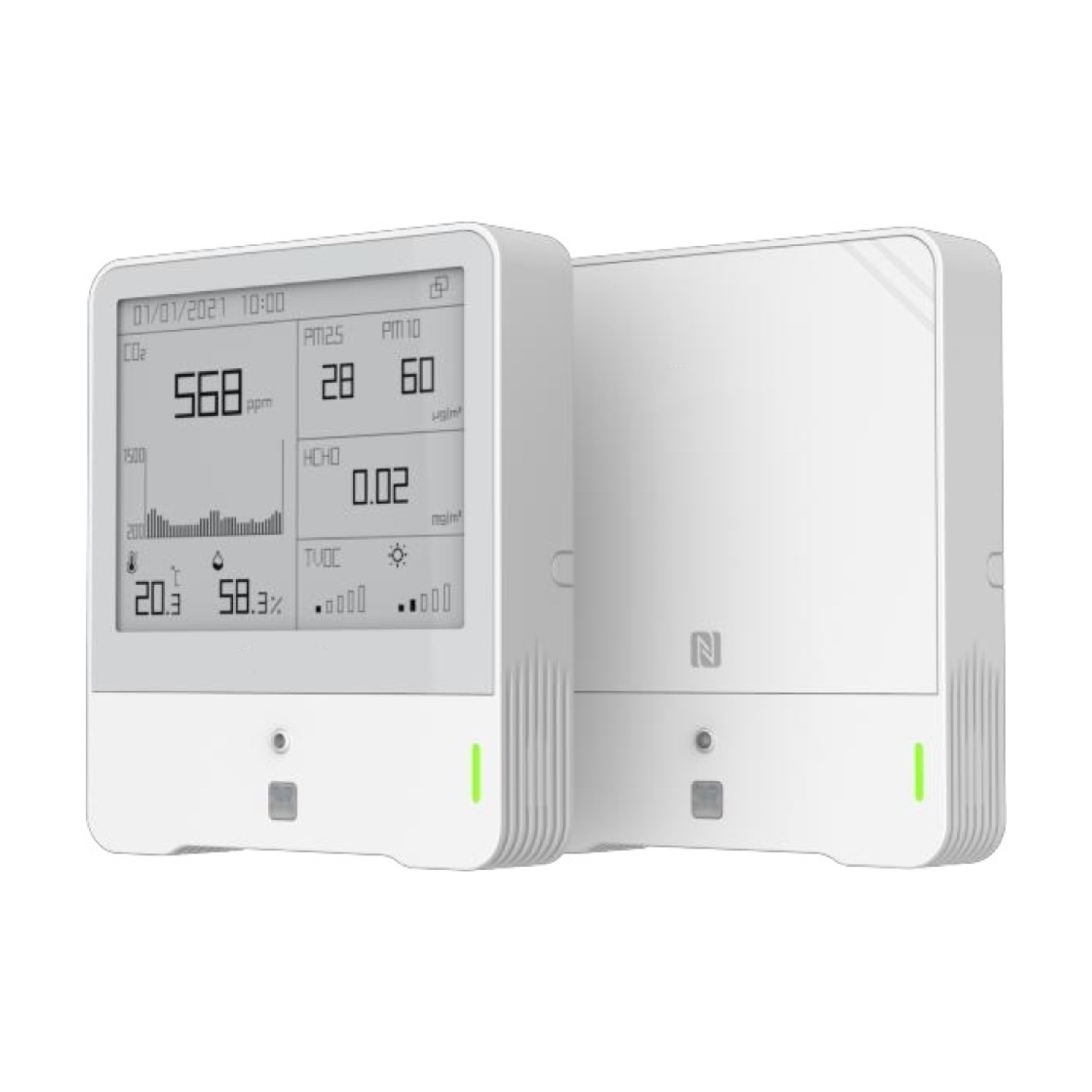 該裝置是一款功能強大、設計精巧的室內環境監測感測器。產品支援同時監測甲醛/臭氧(二選一)、PM2.5 & PM10、溫度、濕度、光照、CO2、大氣壓、TVOC、活動量等多種環境數據,並即時顯示在電子墨水螢幕上,便於在地端查看環境品質數據。
